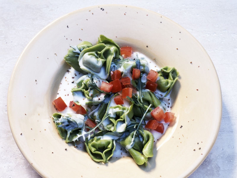 - Cuire les tortellinis à l’eau bouillante salée, égoutter, assaisonner et arroser d’huile d’olive